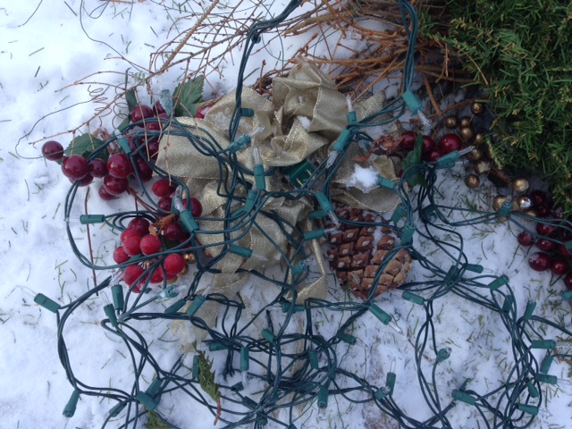 The remnants of Christmas; artificial berries, pine cone, twinkle lights and gold ribbon